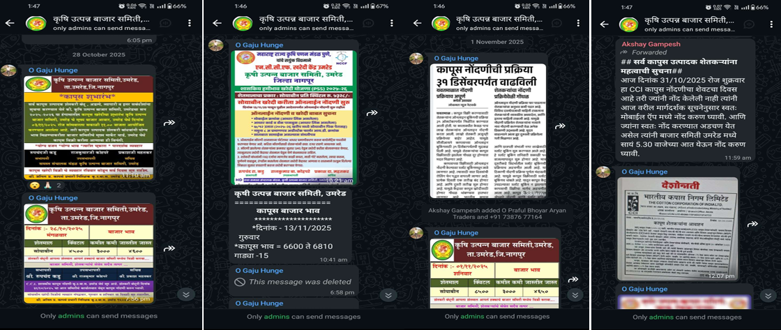 व्हॉट्सअप संदेशाद्वारे शेतकऱ्यांना बाजार समितीचे बाजारभाव, सुचना, कार्यक्रम, योजना यांची माहीती दिली जाते.